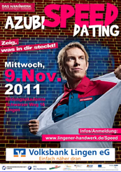 In knapp sechs Wochen, am Mittwoch, den 9. November 2011 ist es soweit: Das zweite „Azubi-Speed-Dating“ startet. Von 15 – 18 Uhr stehen in der Bildungsakademie des Lingener Handwerks am Schwarzen Weg 16 in Lingen 26 Betriebe aus Handwerk und Industrie bereit, um ihre mehr als 160 Ausbildungsplätze zu besetzen. Interessierte Schüler können noch teilnehmen.